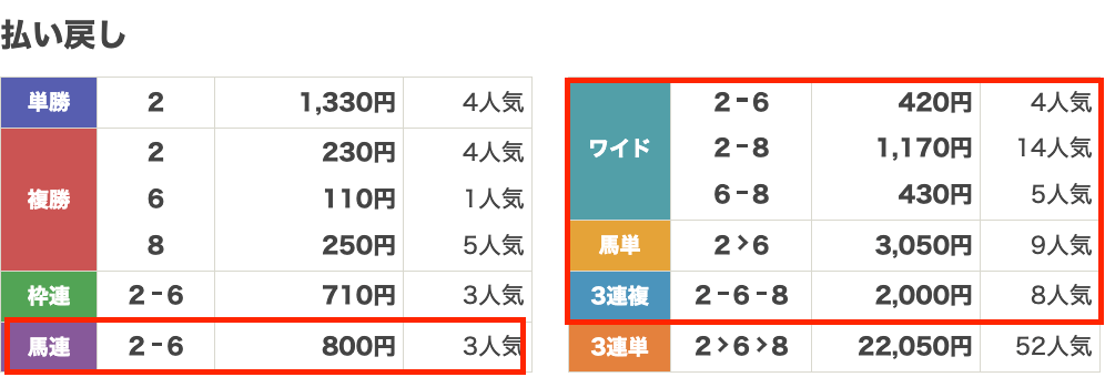 | 払い戻し | 馬連→2 – 6 馬単→2 – 6 ワイド→2-6/2-8/6-8 3連複→2 -6 -8 |