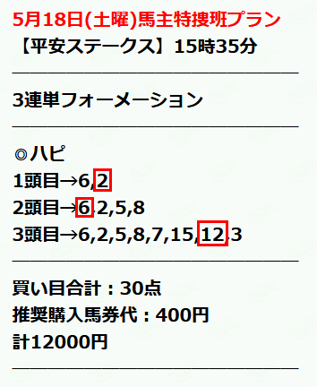 | 馬券代(30点✖️400) | 12,000円 |