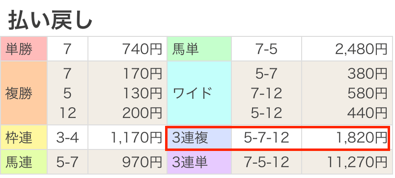 | 払い戻し | 1,820円 |