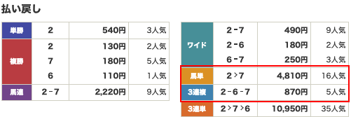 | 払い戻し | 馬単→4,810円 3連複→8,70円 |