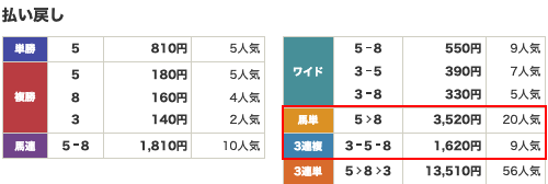 | 結果 | 馬単→5-8 3連複→3-5- 8 |