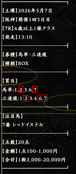 | 結果 | 馬単→2-7 3連複→2-6- 7 |