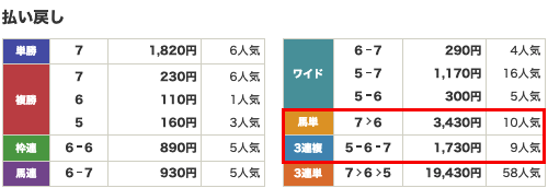 | 払い戻し | 馬単→3,430円 3連複→1,730円 |