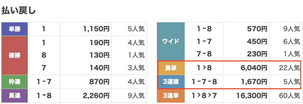 | 結果 | 馬単→1-8 3連複→1-7- 8 |