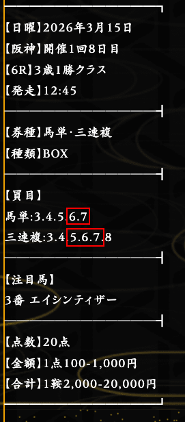 無料の阪神6R、馬単と3連複どっちも当たりました!私は100円ずつお試しで買ってみたけど、それでも合計3,720円のプラス。20点BOXとか少し多いかな?と思ったけど、これだけしっかり仕留めてくれるなら納得の買い目ですね。明日の有馬記念も、ここの「数値の裏付け」を信じて乗ってみようと思います!