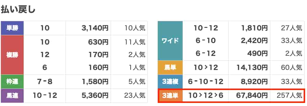 京都12Rで3連単的中!まさかの67万円超えの払い戻しになりました。10番人気の1着固定なんて自分じゃ絶対無理…。