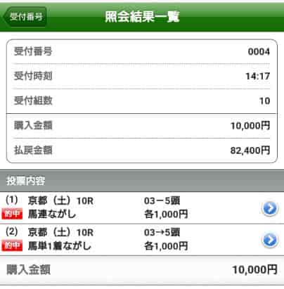 京都10R[コントレイルM]の無料情報で馬単3-5を的中! 30,000円の馬券代で、払い戻しは27万円(4,590円×6,000円)!馬連も当たってたし、情報の精度が抜群です。これが無料のレベルなら、有料情報も期待大!
