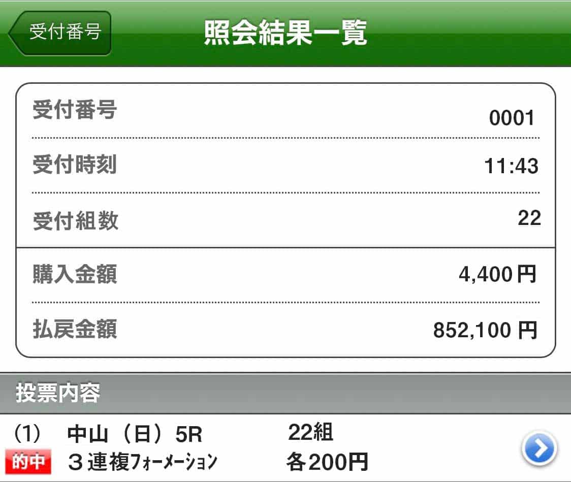 ハーレム競馬匿名参加費8万円は勇気がいりましたが、松下マリカプランを信じて正解でした。 8日の地方ではなく中山5R、3連複でまさかの85万2100円払い戻し!目標配当80〜90万って書いてあったけど、本当にその枠内に一撃で放り込んできました。 正直、3連複でこれだけ跳ねさせるマリカさんの相馬眼には脱帽です。もう他のプランには戻れません。👉 検証結果を見る