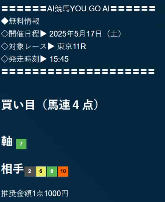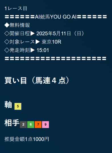 YouGoAIは、東大卒エンジニアが開発した競馬予想AIと、馬主・調教師の極秘情報を融合させた高精度の予想サービスです。AI分析による買い目提供と、的中実績の高さが口コミでも話題。無料登録で初心者でもプロ級の予想が体験可能。